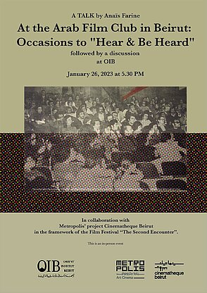 Anaïs Farine is a cinema studies researcher and a film curator. She holds a Ph.D from the University of La Sorbonne Nouvelle – Paris III. Her Ph.D thesis focused on the so-called “Euro-Mediterranean dialogue” and its Filmic Imaginary (1995 – 2017). Her writings have been published in Kohl, Cinematheque Beirut, Trouble dans les collections, Ettijahat, Débordements, The Funambulist Magazine, Africultures, and Aniki, among others. She is a member of the organizing committee of the Festival Ciné-Palestine (Paris). Anaïs Farine is currently a Visiting Postdoctoral Fellow at the Orient Institut Beirut. She joined the OIB in October 2022 and is currently working on the research project "The making of “Arab alternative cinema” and its audiences: Babelsberg, Beirut, Damascus, Leipzig".