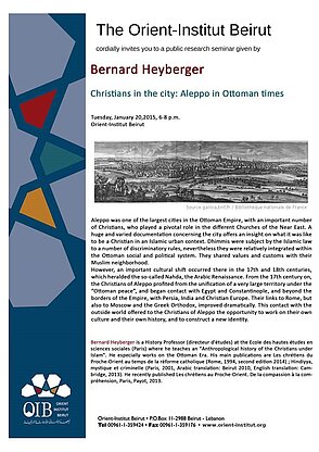 Bernard Heyberger is a History Professor (directeur d'études) at the Ecole des hautes études en sciences sociales (Paris) where he teaches an "Anthropological history of the Christians under Islam". He especially works on the Ottoman Era. His main publications are Les chrétiens du Proche-Orient au temps de la réforme catholique (Rome, 1994, second edition 2014) ; Hindiyya, mystique et criminelle (Paris, 2001, Arabic translation: Beirut 2010, English translation: Cambridge, 2013). He recently published Les chrétiens au Proche-Orient. De la compassion à la compréhension, Paris, Payot, 2013.