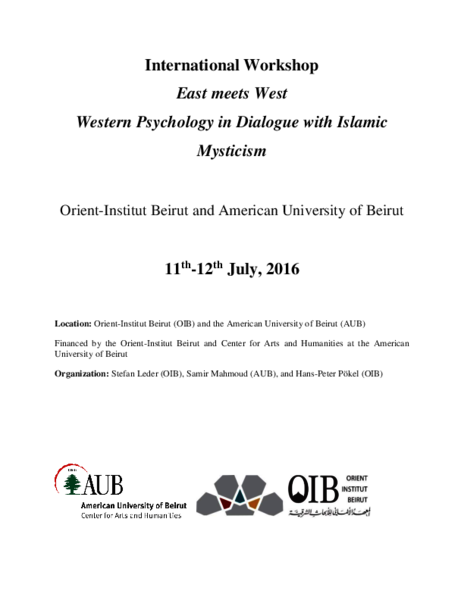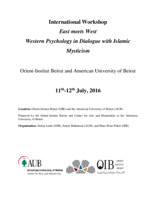 The international workshop East meets West. Western Psychology in Dialogue with Islamic Mysticism aims to start a dialogue and a building of bridges between the Western psychological and the Islamic mystical tradition. The workshop is intended as a first step in what is hoped to be a series of events centered in the region with a larger conference being planned for the future in the Middle East region (Istanbul or Cairo).