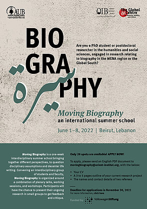 The Orient-Institut Beirut (OIB) in collaboration with the American University of Beirut (AUB) and the Global (De)Centre (GDC) invites doctoral and postdoctoral researchers to apply for an international Summer School, entitled Moving Biography, that will take place in Beirut/Lebanon from 1 to 8 June 2022.