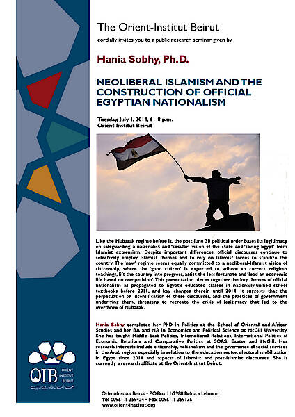 Like the Mubarak regime before it, the post-June 30 political order bases its legitimacy on safeguarding a nationalist and ‘secular’ vision of the state and ‘saving Egypt’ from Islamist extremism. Despite important differences, official discourses continue to selectively employ Islamist themes and to rely on Islamist forces to stabilize the country. The ‘new’ regime seems equally committed to a neoliberal-Islamist vision of citizenship, where the ‘good citizen’ is expected to adhere to correct religious teachings, lift the country into progress, assist the less fortunate and ‘lead an economic life based on competition’. This presentation pieces together the key themes of official nationalism as propagated to Egypt’s educated classes in nationally-unified school textbooks before 2011, and key changes therein until 2014. It suggests that the perpetuation or intensification of these discourses, and the practices of government underlying them, threatens to recreate the crisis of legitimacy that led to the overthrow of Mubarak.