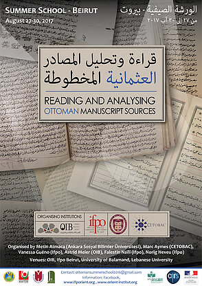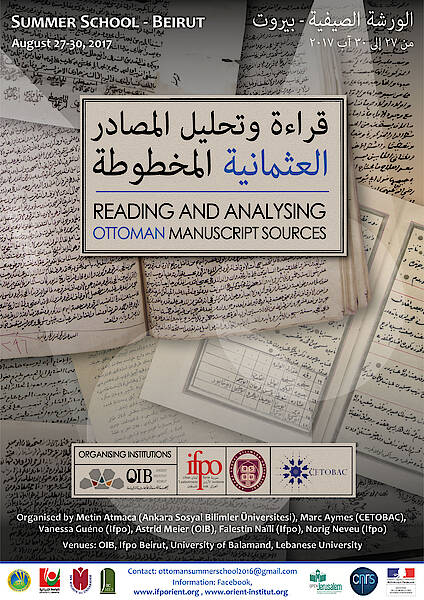 The French Institute of the Near East (Ifpo), the Orient-Institut Beirut (OIB), the University of Balamand, the Lebanese University (Doctoral School of Literature, Humanities and Social Sciences), the Center for Turkish, Ottoman, Balkan and Centralasian Studies (CETOBaC), the Ankara Sosyal Bilimler Üniversitesi, the İbn Haldun Üniversitesi, and the Japan Center for Middle Eastern Studies (JaCMES) with the support of the Open Jerusalem project are organising a summer school devoted to reading and analysing Ottoman manuscript sources. This is the second edition, following the summer school of 2016 in Amman, Jordan.