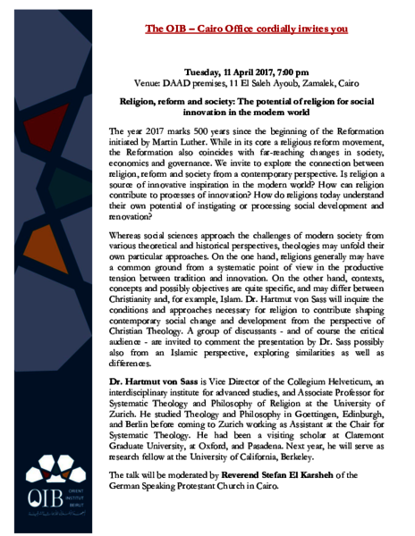 The talk will be moderated by Reverend Stefan El Karsheh of the German Speaking Protestant Church in Cairo.