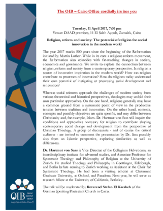 The year 2017 marks 500 years since the beginning of the Reformation initiated by Martin Luther. While in its core a religious reform movement, the Reformation also coincides with far-reaching changes in society, economics and governance. We invite to explore the connection between religion, reform and society from a contemporary perspective. Is religion a source of innovative inspiration in the modern world? How can religion contribute to processes of innovation? How do religions today understand their own potential of instigating or processing social development and renovation?