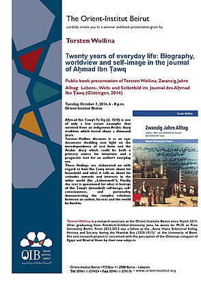 Torsten Wollina discusses it as an ego-document shedding new light on the interdependence of text form and the Arabic diary which could be both a primary source for historians and a pragmatic text for an author’s everyday use.